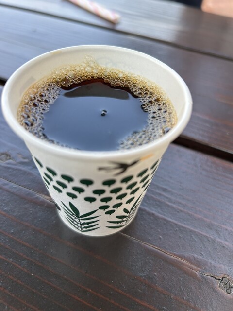 サービスでいただいたコーヒーと購入したクロックムッシュを早速外のテラス席でいただきました。