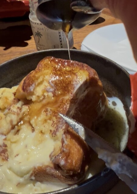 プレーンの方はホイップバターのみでとろけ出してる。バターの風味が強めで甘み少なめなので、しっかりメープルシロップをかけないと。でも小さなカップにほんの少ししか入ってない。店員さんは、すごく甘いから少しだけにした方が良いですって言ったけど、私には全然甘味がたらず、結局3回おかわりしました(無料)。でも、本当にトーストがとろっとろにとろけてホイップバターとシロップが混ざりあって甘くて美味しい!全部あっという間に飲み干しました。ご馳走様でした。