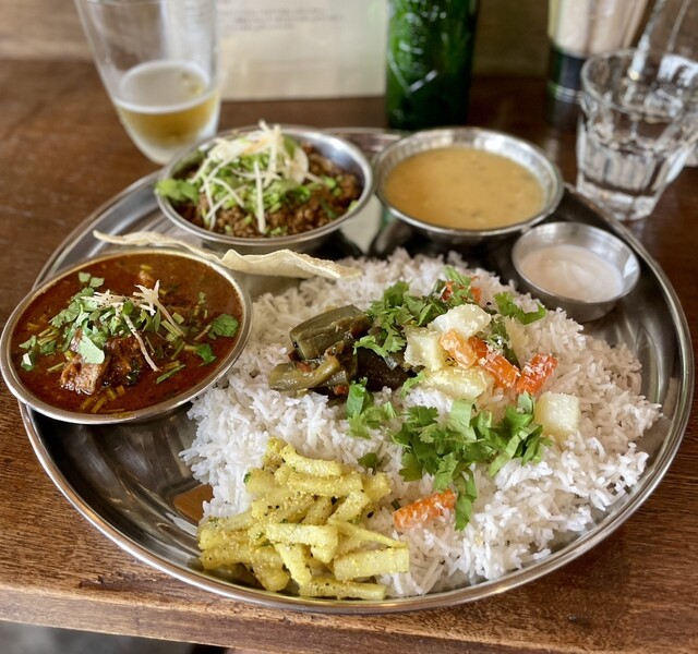 サーブされるプレートには、2種のカレーと、副菜(野菜のアチャール、サブジがモリモリ)がバスティマスライスにのっていて、ダル(豆のカレー)とヨーグルトとパドバがついている、オールインワンタイプ≒ミールスな感じ