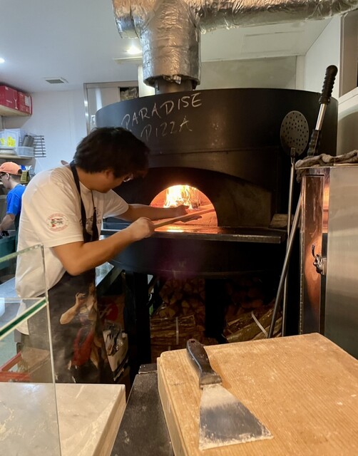 ヒゲ店主によって、薪窯に我々のピザがインする瞬間