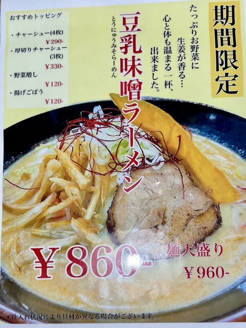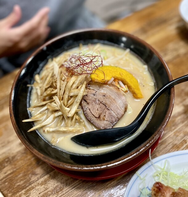 相棒のメインディッシュ 豆乳味噌ラーメン(期間限定メニュー)揚げた根野菜と野菜炒め+生姜が隠し味で効いて、激ウマとの事
