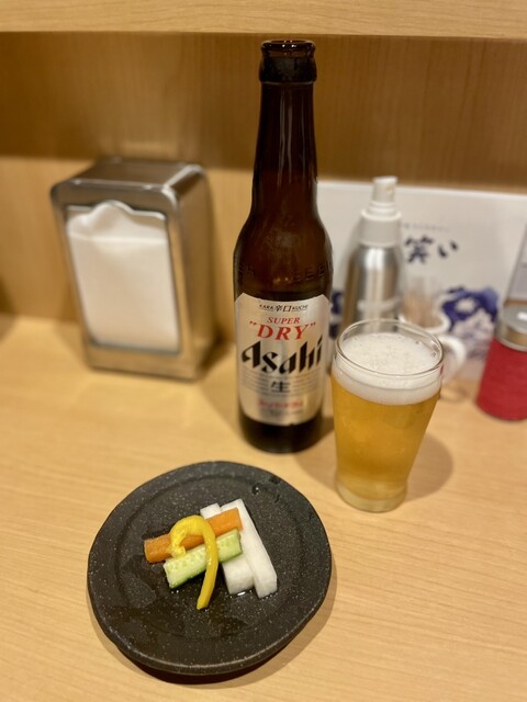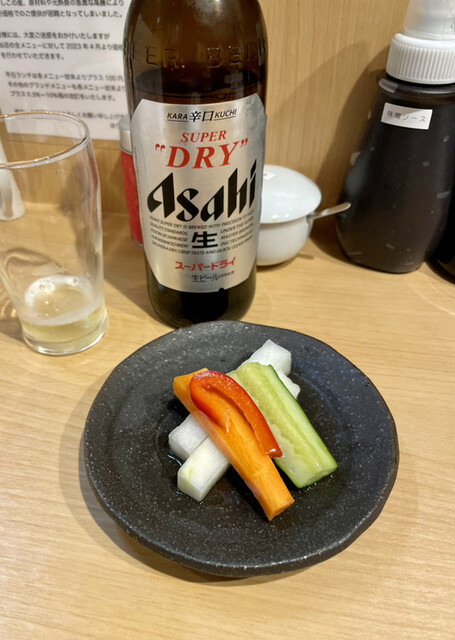 スタートはスーパードライ小瓶とピクルスで揚げあがりを待つべし