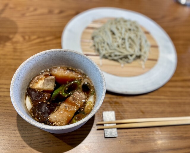 豚肉(富士桜ポーク)つけ蕎麦の汁 強目の返しの効いた濃い目の汁に厚切りの豚肉と葱がゴロゴロ入っていて、堪らんやつ