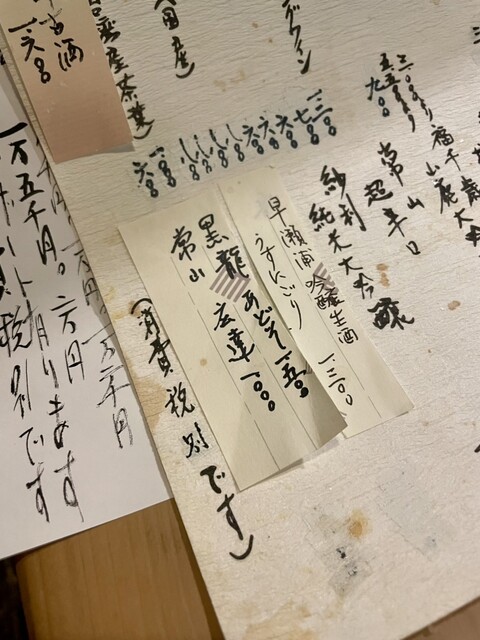 初見で、そのメニューを解読+適切なセレクトと構成するのはハードル高いので、お任せのコースを予算に合わせて予約するのが吉(1.1万、1.3万のコースはネットから予約可能、それ以外にも1.5万、2万のコースも手書きのメニューを見る限りある様子)