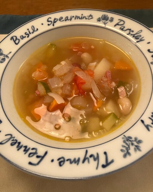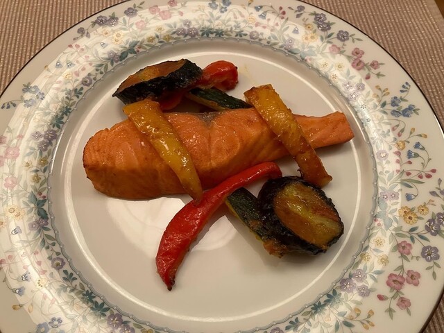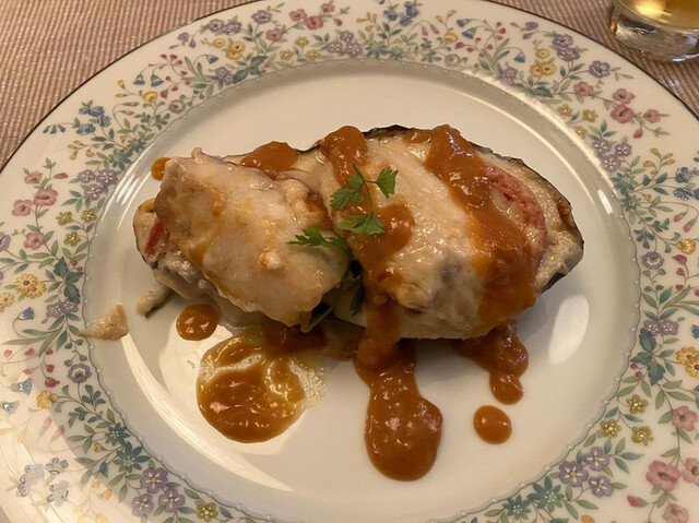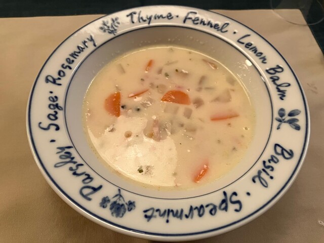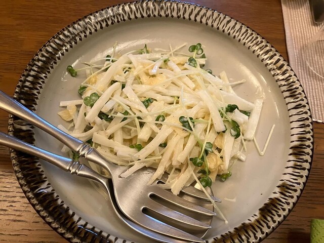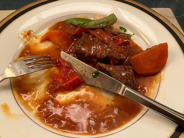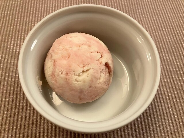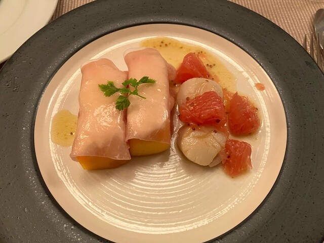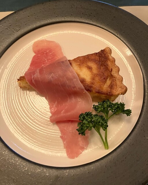 定番のキッシュとサラダ。サラダいつも違うものが出て来て、どれも美味しい。スープはじゃがいものポタージュ。魚料理はサーモンのトマトソース。このソースもただのトマトソースではない感じ。肉料理はミスジのステーキ、醤油とオニオンのソースかな?。デザートはリンゴ飴。