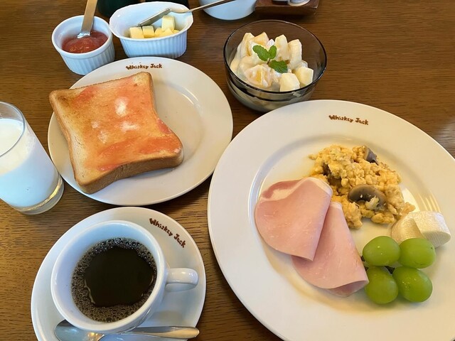 朝食は定番な感じ。玉子は今日はキノコのスクランブルエッグ。フルーツはシャインマスカット。ハムとチーズは定番。何気ないサラダも美味しい。トーストはおかわりできますが、しなくても十分。写真の他に牛乳もつきます。
