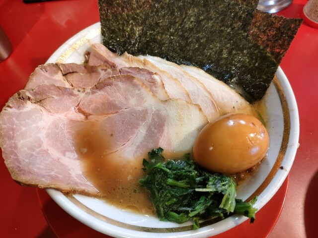チャーシュー麺5枚、味玉、家系ネギ豚丼赤辛大をいただきました