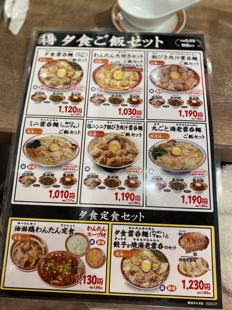 いつも行列でずっと気になっていたので入ってみました。お店は屋台みたいで楽しいです。夕食セットがあったので粗挽き肉ワンタン麺と高菜ご飯のセットにしました。短いレンゲがついてきてワンタンをテーブルにある好きな調味料で食べてくださいとの事で塩生姜、食べるラー油、甘酢玉ねぎ、ゆず七味、黒酢と順番に食べてみました。どれも美味しいです。私はラー油と黒酢が好きでした。ワンタンもたくさん入っててご飯も量が多くお腹いっぱいいただきました。