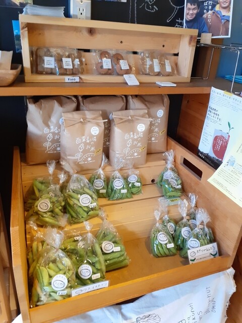 レジ前にはおもや農園の野菜やお米、クッキーなどの販売があります。