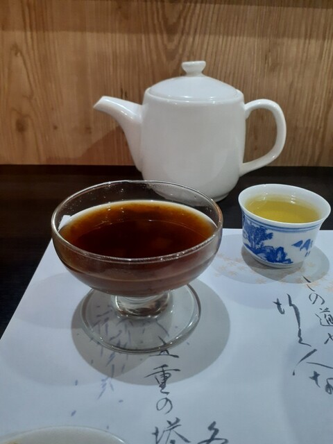 温かいお茶は、説明受けましたが覚えられませんでした。とても美味しい。お菓子にミニドーナツ。