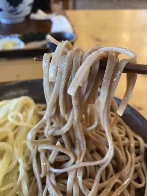 お蕎麦色の麺は平打ち風。