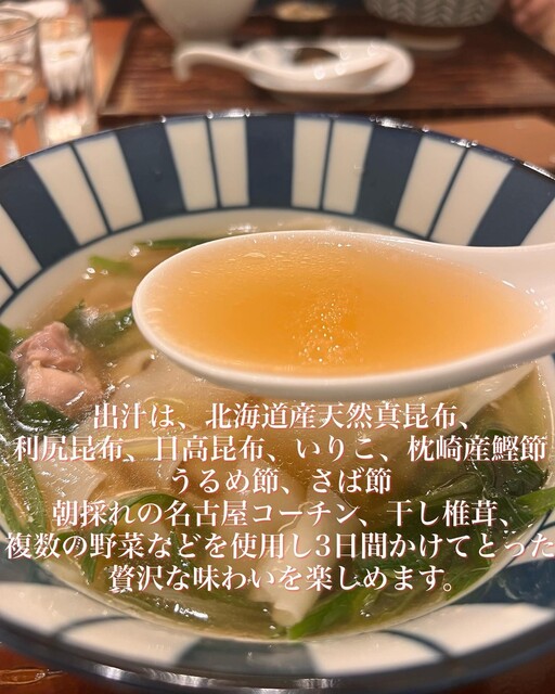 朝採れの名古屋コーチン、干し椎茸、複数の野菜などを使用し3日間かけてとった贅沢な味わいを楽しめます。