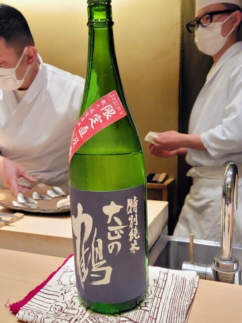 冷酒は愛知県の醸し人九平次赤磐雄町、岡山県の大典白菊きもと濁り、岡山県の多賀治、富山県の勝駒、岡山県の三冠、静岡県の開運、宮城県の日高見弥助です。