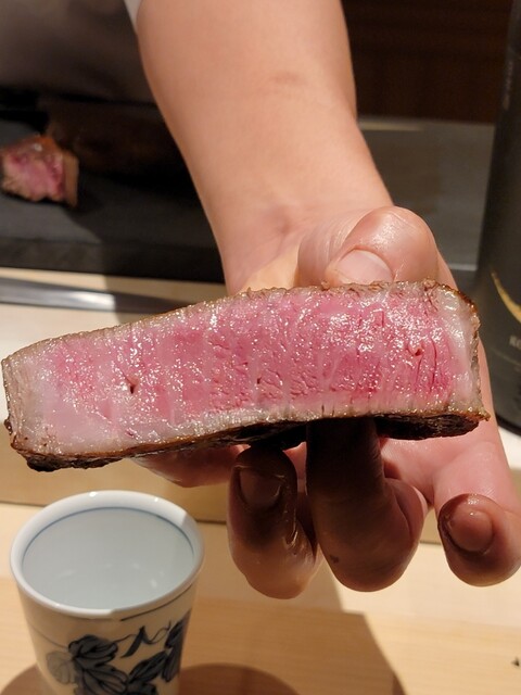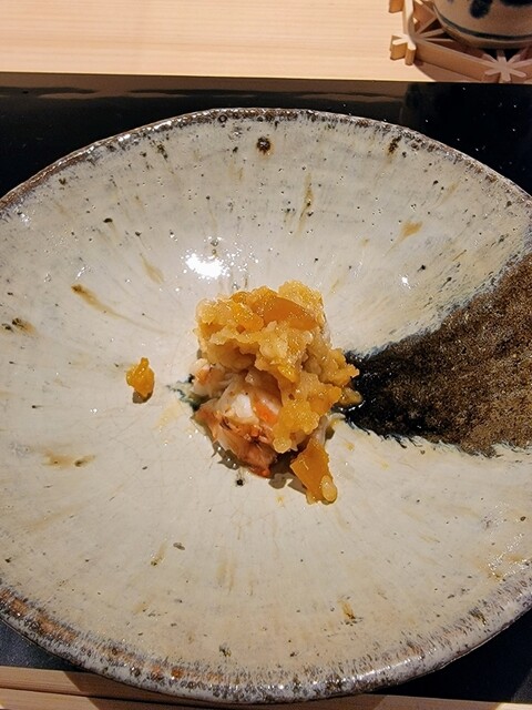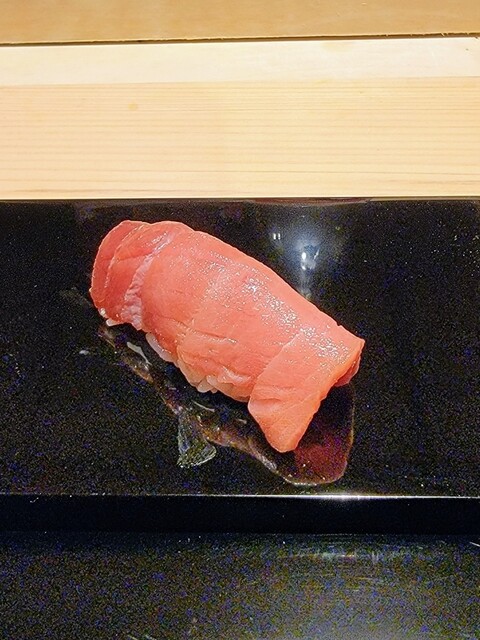 肴は夏野菜のお浸し、ポン酢ジュレとカリフラワーのすり流し、大分の蒸し鮑、お造りはオコゼ、グロテスクですが身は美味しい。唐墨はちょい炙りで、お造りは鯵、あおり烏賊、本ミル貝、仙崎のウニ、沖縄の鮪です。鮪は180キロとのことで赤身とトロ、トロの握り寿司をいただきました。