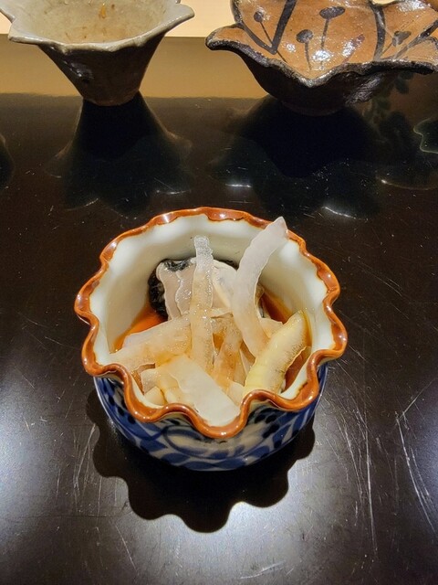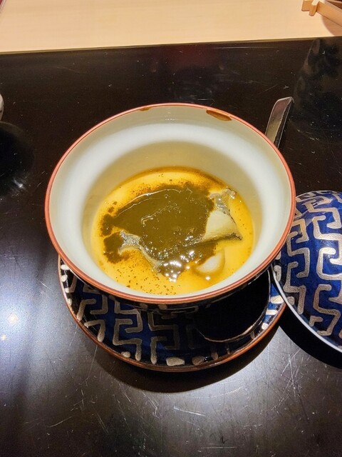 鮑とアコヤガイの茶碗蒸しに鮑の肝ソース。