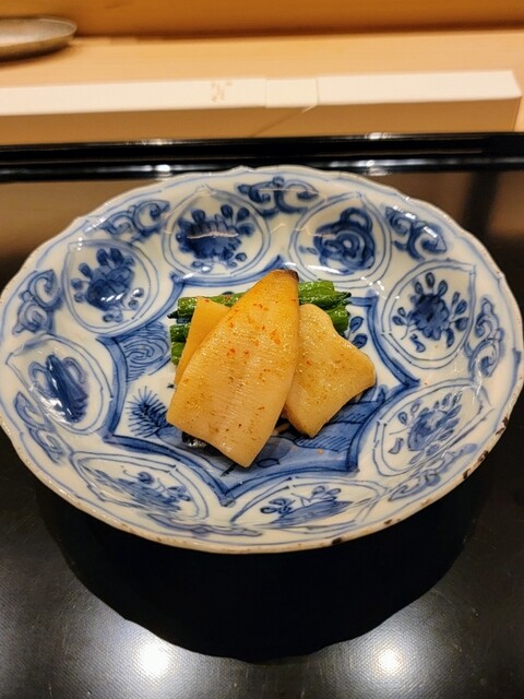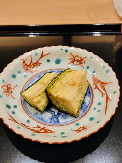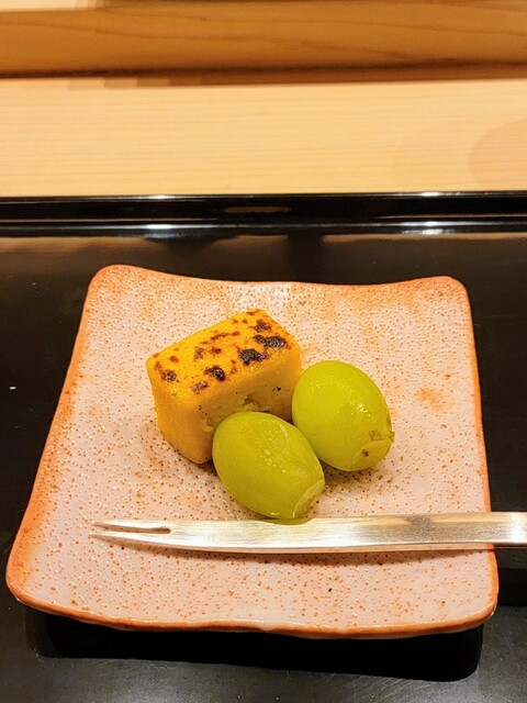 先付けは石垣貝と翡翠茄子、貝の歯ごたえと