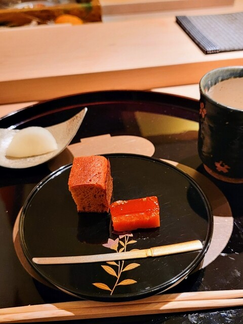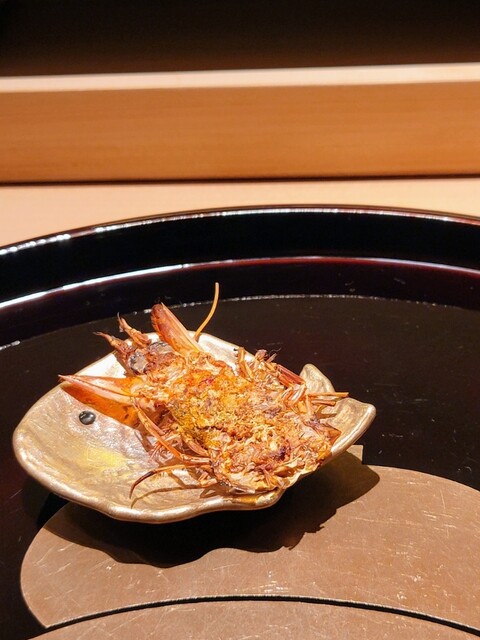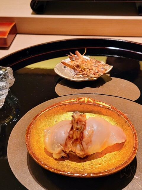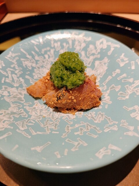 三河湾のタイラギの米粉揚げと自家製唐墨