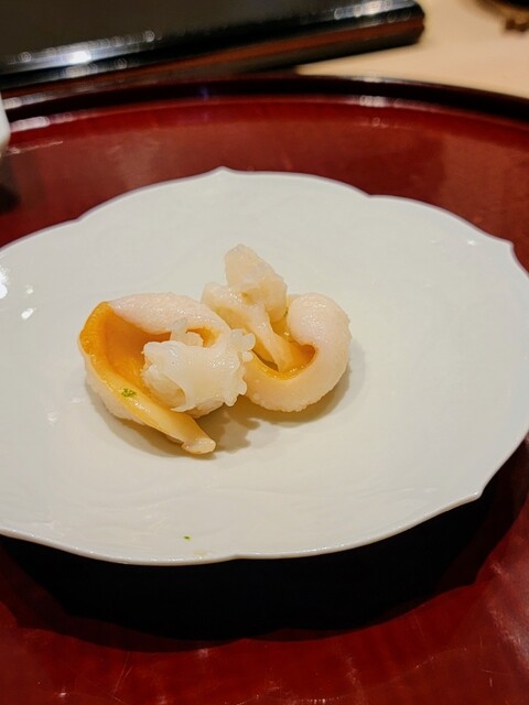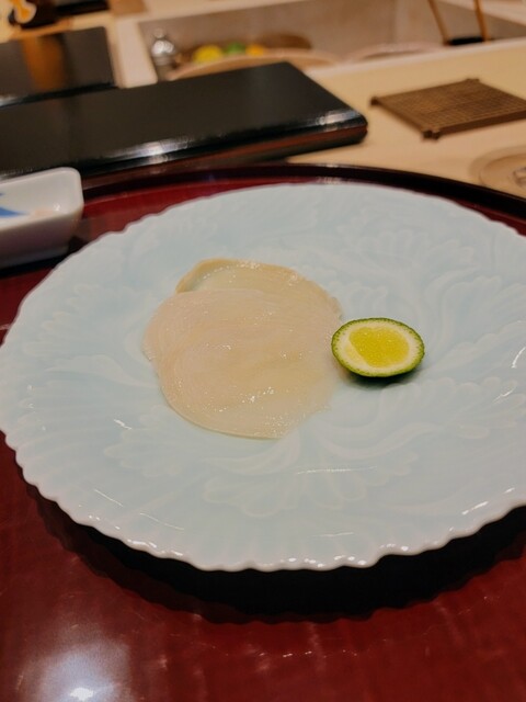 本ミル貝、出汁醤油に軽く漬けスダチを搾り