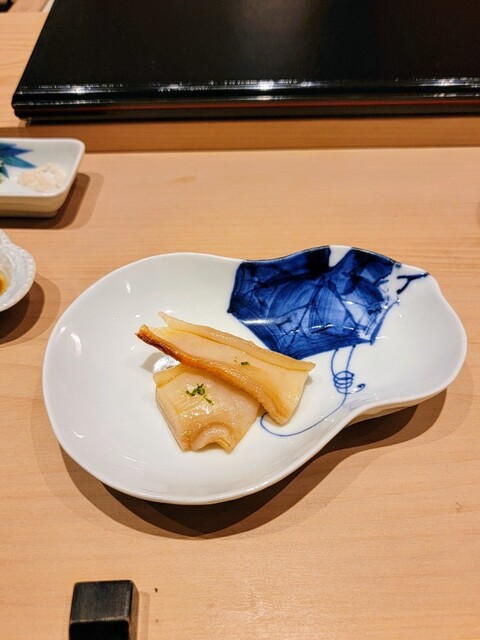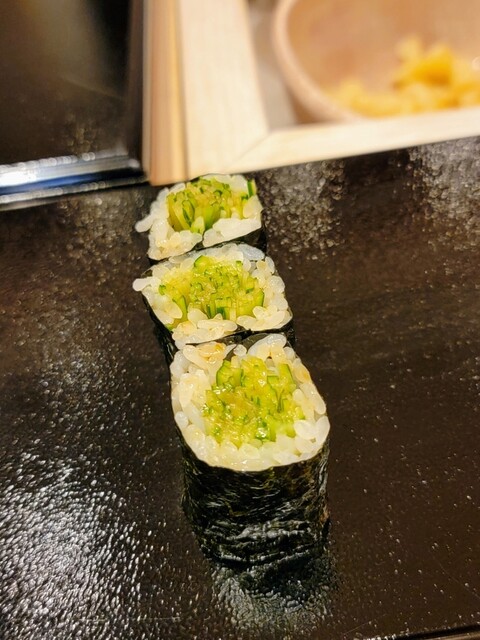 求肥(りゅうひ)昆布巻きの鯖寿司を海苔で挟んで手渡し、明石の鯖