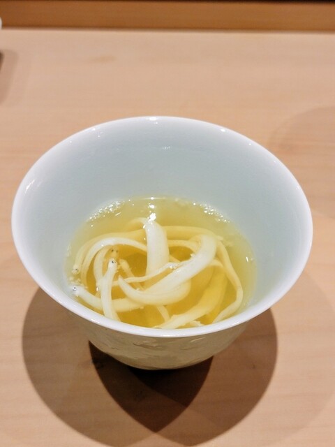 ・ノドグロを薄切りにした蒸し寿司、ポン酢