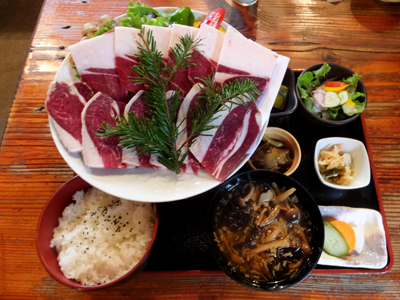熊鹿肉・野菜焼・ごはん・きのこ汁・サラダ・小鉢3種類・お漬物