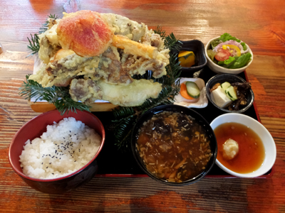 きのこ天ぷら・ごはん・きのこ汁・サラダ・小鉢2種類・お漬物