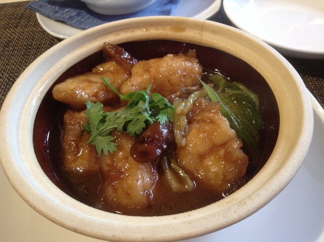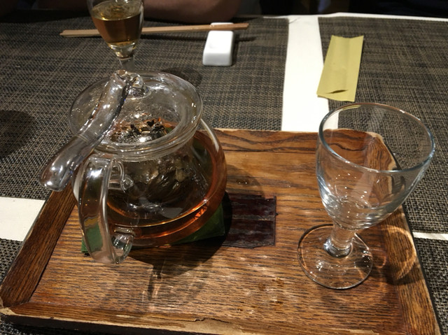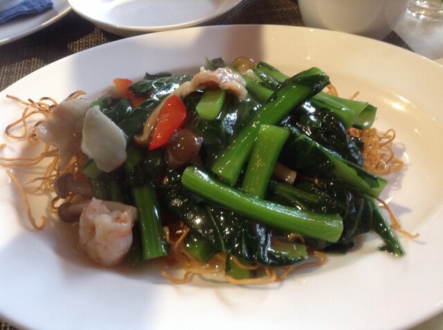しかし、他のふたりは飲む、イケる口です。なのでまずは蒸し鶏を注文しました。10年物の紹興酒を飲むふたりを横目に、早く香港海鮮焼きそば食べたいなぁと待ってました。次に和牛と中国野菜です。これが、この野菜がとっても美味しい。聞くとチシャの茎の部分だと言う。見た目はセロリっぽいが程良い硬さとくせのない味です。次に中国のブロッコリーと言われている野菜、そして海老シュウマイ。それから黒ムツ…美味しい。それから、やっと香港海鮮焼きそば。お酢をたっぷりかけていただきました。思えば前身の老香港の時からこれに、はまっていました。最後のお茶は東方美人と言うウーロン茶の種類らしいです。さっぱりしますね。こちらのオーナーは昔から料理のいわれに詳しく、見せ方上手です。聞くといつの間にか2階にもお店が出来ていました。驚き。なので、フェニックスのように蘇った、施家菜さんと言う印象を持ちました。