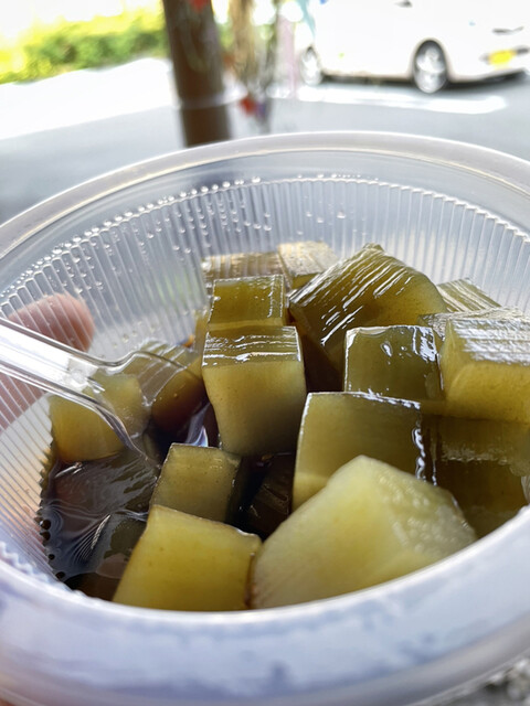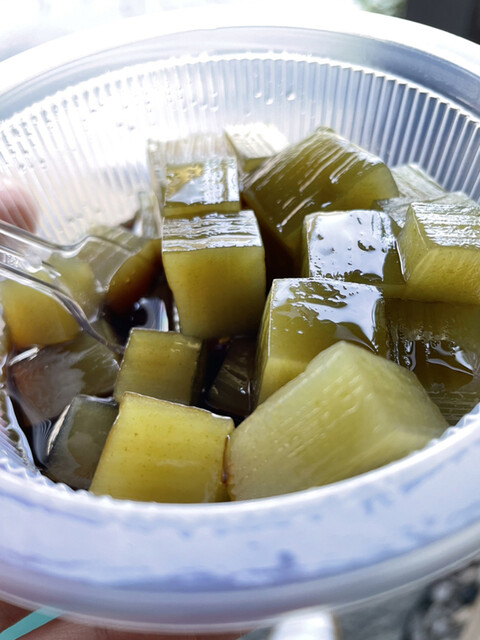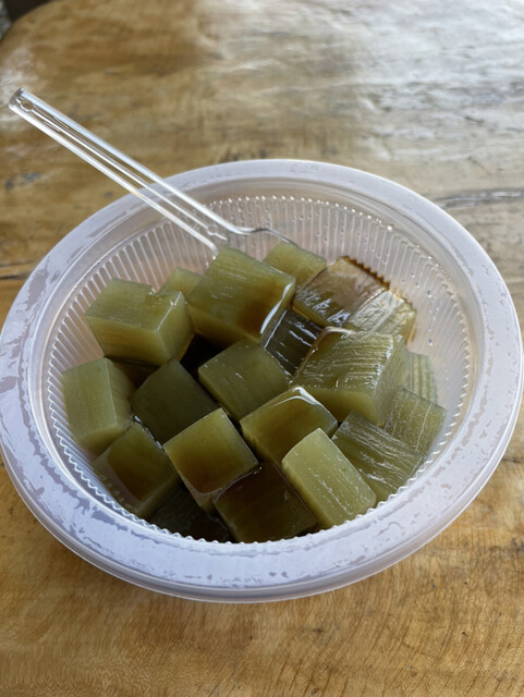 今日はいつもの豆乳、キズ揚げ(お得な油揚げ)、久しぶりに抹茶ところ天黒蜜入りを購入。