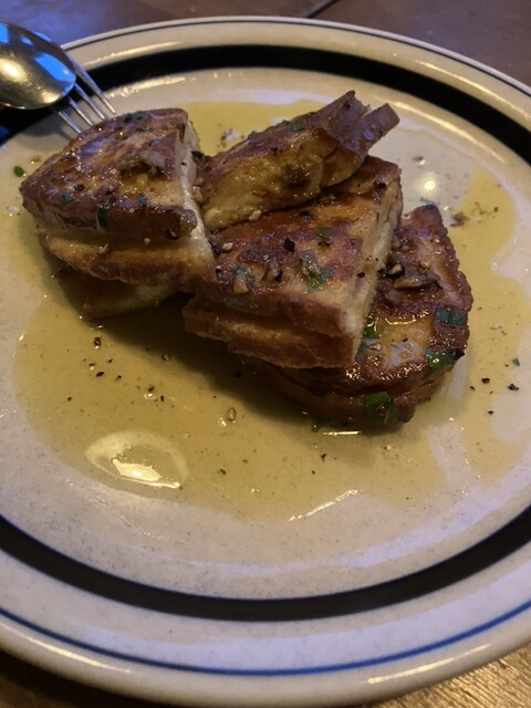 そろそろお腹もくちくなってきたので、メインの肉料理に。名物のダークチェリーソースのローストチキンを食べたかったがそちらも品切れとの由で、代わりに店長さんおすすめのポークピッツアイオーラ注文。「ピッツァイオーラ」とは「ピザ職人風」の意で、チーズとトマトソースと肉を重ね焼きにした料理。選りすぐりのチーズに凝縮されたように甘酸っぱいトマトソース、柔らかく仕上げられた豚肉の組み合わせで不味いわけがない。忽ち我々の胃袋に収まってしまう。