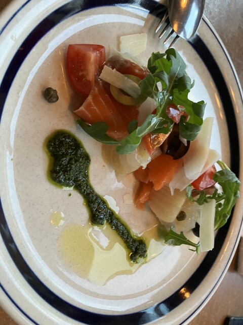 早速サラダがサーブ。グリーンリーフのサラダを主体に、生ハム、サラミといった肉類やゆで卵、トマトにマッシュルーム等々の具材がオン。流石は名にし負うシェフのおすすめサラダ、お味も最高で瞬く間に皿がカラになる。