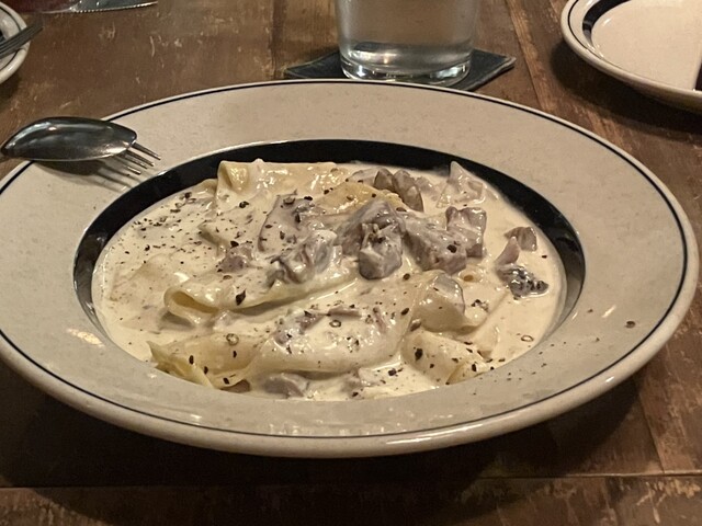 パスタはフォークでくるくる巻いて一口でという訳にはいかない大きさなので、ナイフとフォークで少しずつ切り取って食べる。こってりしたソースが大きなパスタにしっかり絡んでとても美味。残ったソースは付け合わせのパンと一緒に食べる。