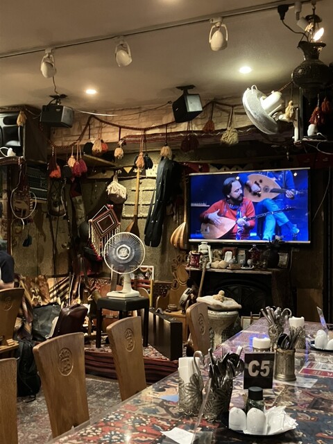さて予約当日。高円寺の阿波踊り大会の混雑巻き込まれてえらい目に遭ったが、どうにか予約時間の1900にお店に到着。店内はそこら中にイランぽい絨毯やら楽器やらオブジェやらが飾られていて雰囲気たっぷり。中央はペルシャ絨毯敷かれたオープンスペースになっており、ベリーダンスショー想定したテーブル配置になっている模様。席は半分くらいは空いていたが、どれも予約済み。入れ替わり立ち替わりお客が入ってきて、その都度店員さんがお断りしており、人気振りに驚かされる。