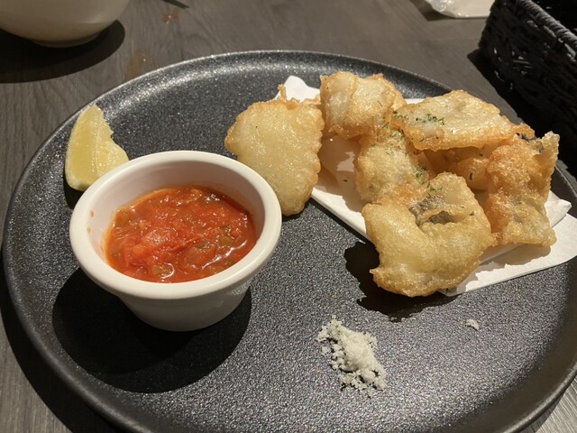 アナゴのフリットは、トマトソースのディップと共にサーブ。白身魚なので変な癖も臭いもなく、ふわふわで淡白な白身魚のフライは赤ワインと合わせても全く問題ない。