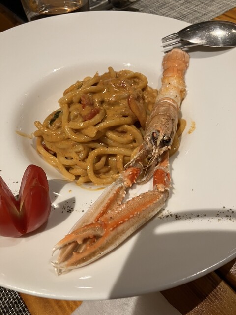 キタッラは伊語でギターの意。羊飼いが羊の番をしている間に、ギターの弦でパスタ生地を裁断して作ったのが起源だそうな。お店の方がキタッラ裁断用の器具を見せて下さったが、大きな枠に鋼線を何本も張り渡したもので、ギターというよりハープのような外観。実際に出てきたパスタはうどんのような太さ。トマトクリームソースで和えて手長エビまるごとをあしらったで、えびはぷりぷりで頭にはミソたっぷり、ごんぶとパスタはもちもちでコシのある讃岐うどんみたいな歯ごたえで、エビ出汁利いたトマトクリームソースがしっかり絡んで実に美味。