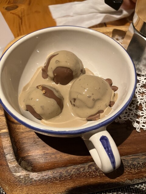 パロツェットは球状に成型したチョコレートケーキ。エスプレッソをかけて頂くが、ほろ苦のチョコレートケーキは大変侘び寂び感のあるシリアスな味。