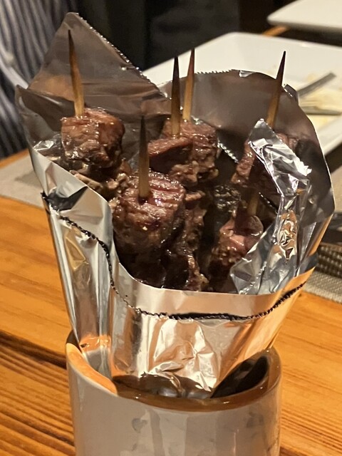 塩コショウで味付けした羊肉を炭火で焼いたシンプルな料理。野趣溢れる脂の乗った羊肉は柔らかくて大変美味。噛めば噛むほど肉汁が出てこの上なく美味。サ〇ゼリアで取り扱われた際は売り切れ続出だったようだが、1本では足りず、習慣性の薬物のように何本もお代わりしたくなる。
