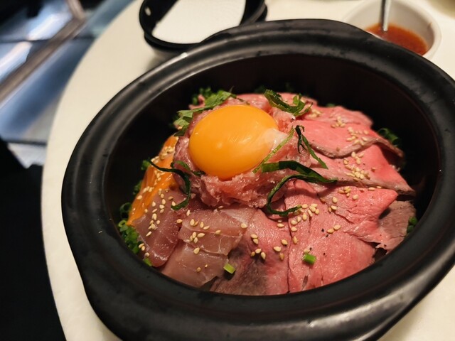 特に肉海鮮土鍋飯は、やばい旨さ、海鮮と肉の上にイクラソースをたっぷりとかける。