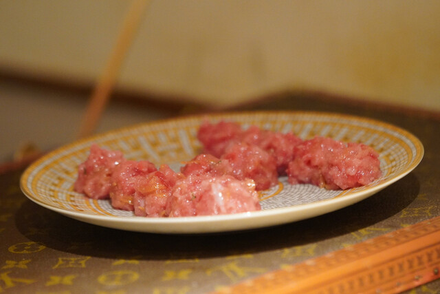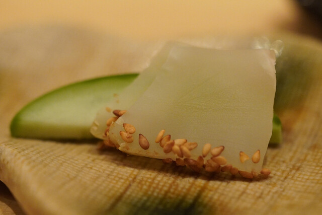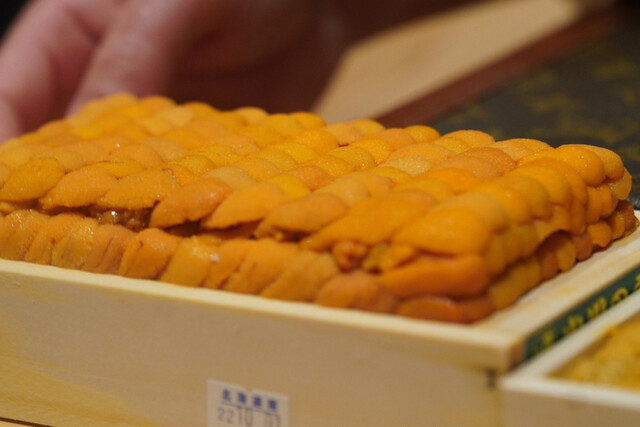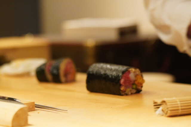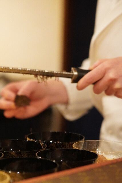 鴨川のタイ噴火湾の毛ガニすみいか フランスの黒トリュフ、うに、まぐろのかままるひろ、こにし、きむら、かねしん(うに)佐賀のコハダ鮑 塩か肝醤油いぶりがっこマスカルポーネ太刀魚 山わさびとらふぐ 白子小柱 軍艦からすみもちまぐろ やまゆきさん背中側の中トロトロキャビアどん兵衛風 のれそれ (アナゴの稚魚)かわはぎ のどぐろかんぬき雲丹あなご