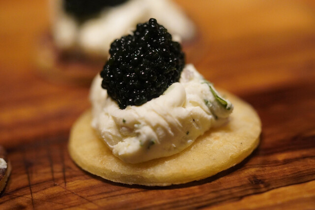 お通し キャビアパンムルソー シャルドネカジキマグロ フリット三田牛カルパッチョ エシェゾー えびのリゾット ロールケーキ キウイ、いちご、