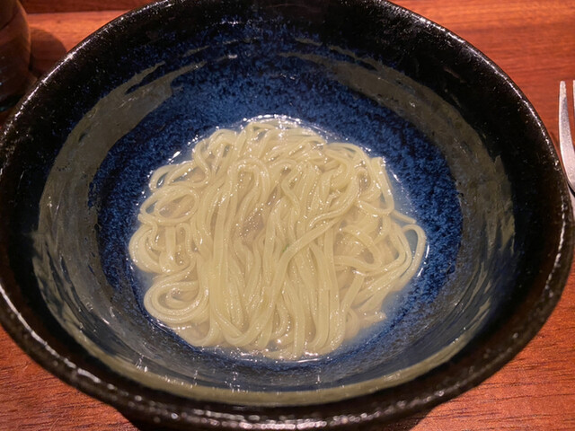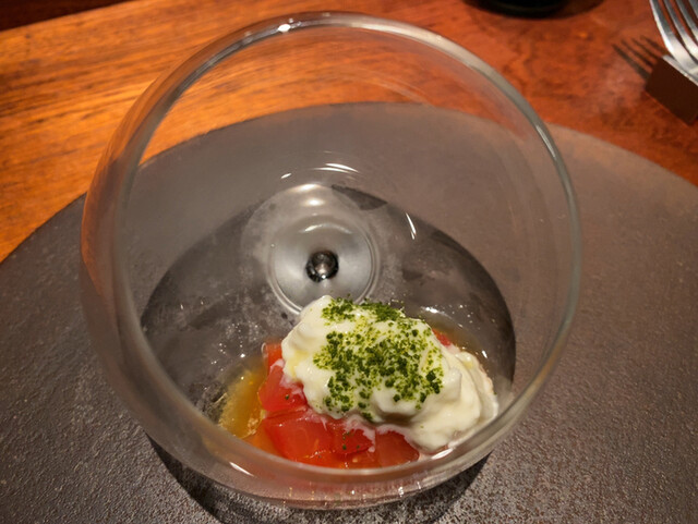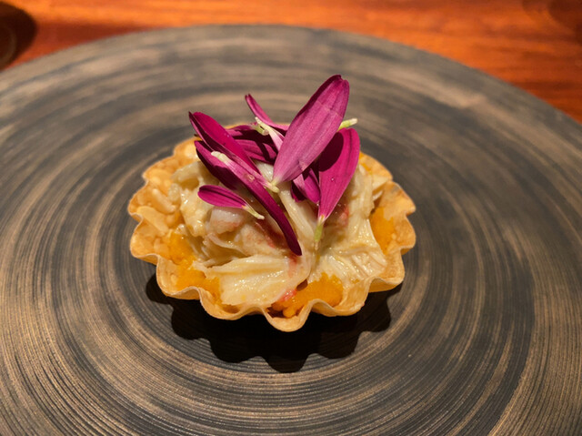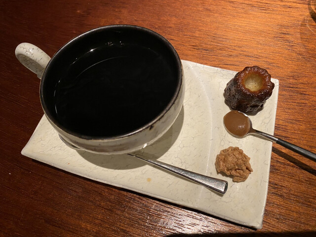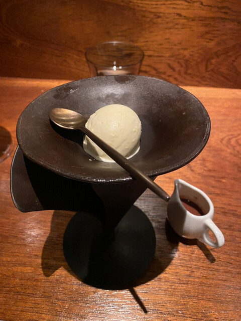 キャビアは半生の状態で石焼き芋にのせてあります。キャビアは生でないからか、磯感が強すぎず甘い焼き芋としっかり合います。キャビアに火を入れるのはこのお店の定番になりつつありますが、このお店以外では出会った事のない調理法です。
