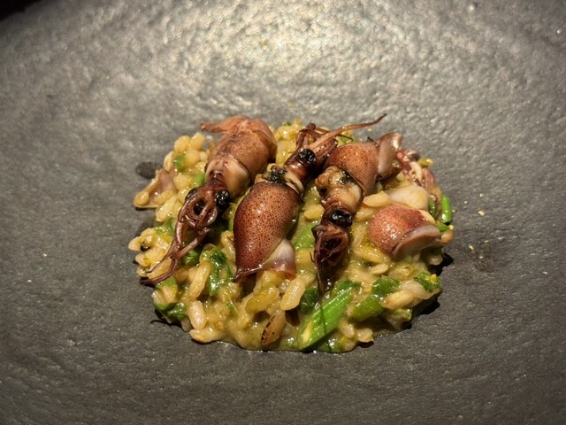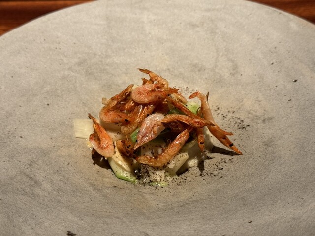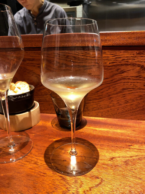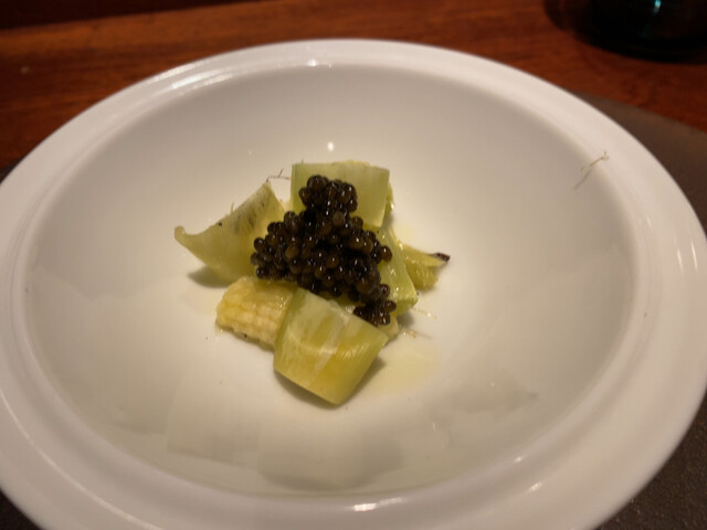 ヤングコーンに合わされるキャビアは少し火が入れられていて半熟卵状態との事。薪のおかげか魚卵感もマイルドでシャンパンにも合います。予想外に優しい塩味で今後のコースの期待感を高めてくれます。