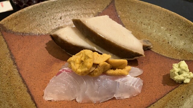 お造りです。アワビ、ウニ、鯛です。アワビは