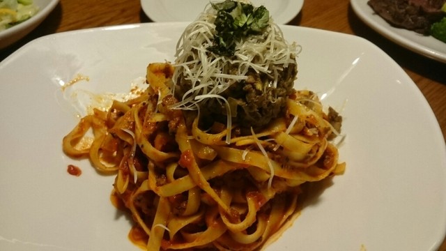 パスタの上にボリューム満点の粗めの牛肉がゴロゴロしてます。