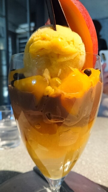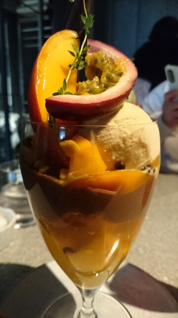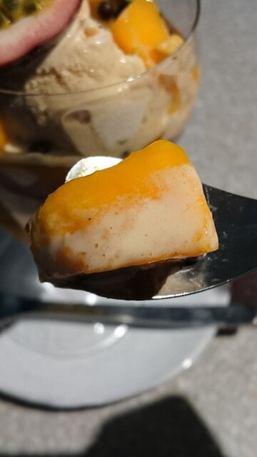 マンゴー/パッションフルーツ/タイム/マンゴージェラート/紅茶のジェラート/パッションフルーツジュレ/チョコプリン/ティラミス/パッションフルーツのソース/あとゎ忘れてしまったけどたくさんの層で構成されたパフェです