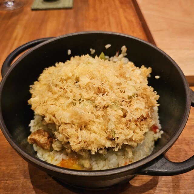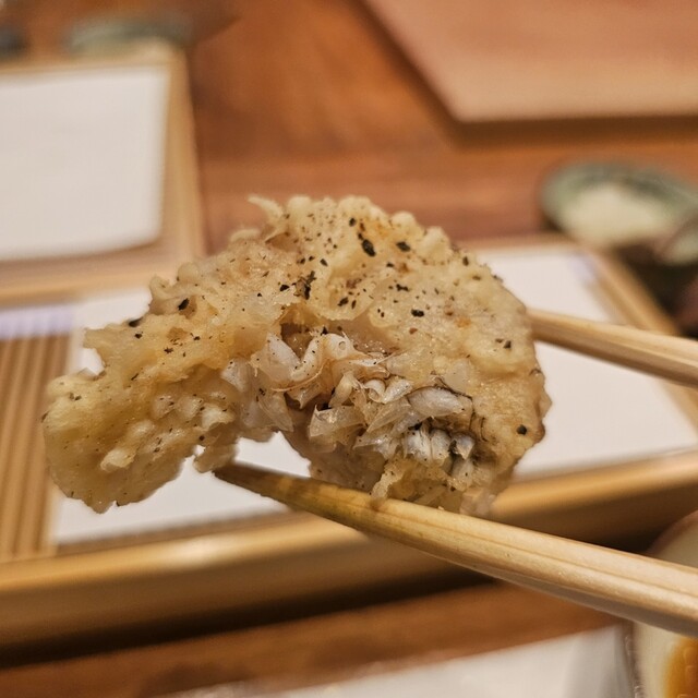 仕上げに芝海老・ホタテ・アスパラのかき揚げ