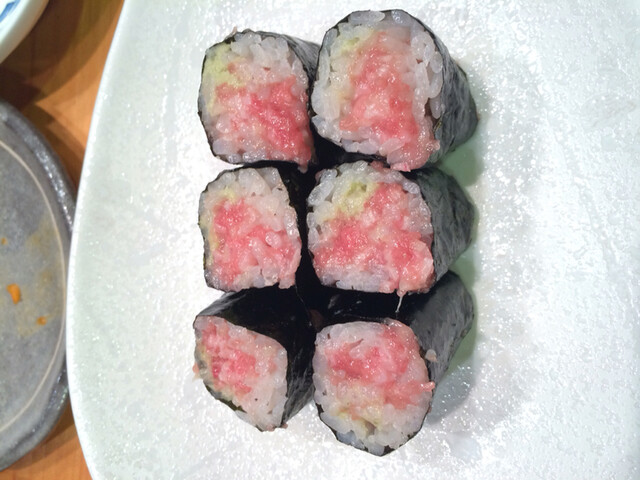 さんまは言うもがな美味しい。ネギトロ巻きも、普段食べる鉄火巻とは雲泥の差。大トロ、中トロの切り落としと中落ちをまな板でたたき、それを巻く。巻き方もふわっと柔らかく、何個も食べられそう。逆に、トロの握りより巻きの方が美味しく感じるのでは?