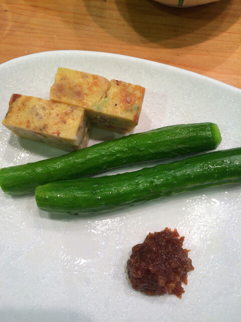 だし巻き卵は蟹、ネギ等が細かく刻んで入っていて、きゅうりはこれも自家製の南蛮味噌を付けて頂きました。南蛮味噌、最高ですね。白ご飯が欲しくなりました。