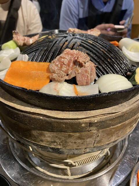 飛び石三連休の中日の平日に訪問。絶対に混むと思い2週間前に電話予約した時間は、16時30分。ホテルの朝食ブッフェをしこたま食べて、お昼抜きでお腹を調整して行きました。開店時刻10分前、すでに大勢のお客さんが並んでいます。その最後尾に並べと言われたので、並びます。もしやみなさん予約してある方々?開店と同時にどんどんお客さんが入ります。予約していても、全員揃っていないと、後に回されます。家族四人で行ったので、2階の座敷に通されます。コートは、煙が付かないよう、扉付きのコート掛けにしまいます。七輪に成吉思汗鍋が載っています。この成吉思汗鍋はちょっと変わっていて、鍋のすじが凹みではなく、切れ込みになっていて、そこから油が落ちるようになっています。だからでしょうか、もやしなど切れ込みから落ちそうな小さな野菜はありません。焼き野菜は初めの一皿はサービス。あとは有料で追加です。いろいろ入っている、一番セット、羊タン、ラムチョップ、ラムTボーンなど一気に頼み、どんどん焼いていきます。どれも臭みなく、柔らかく美味しいです。ラム肉嫌いの方にぜひ食べてもらいたい。オリジナルのタレも美味しいし、オリジナルハーブソルトもイケる。あと、そぼろスープというスープも美味しい。何皿食べたのか?とにかくお腹いっぱい。ビールはメガジョッキ2杯呑んでしまった。4人で18,000円ちょっと。安い。サッポロビール園で食べた時より安い。近くにあったら定期的に行きたいお店です。お肉へぜひオンラインショップで地方にも売って欲しい。ご馳走さまでした。