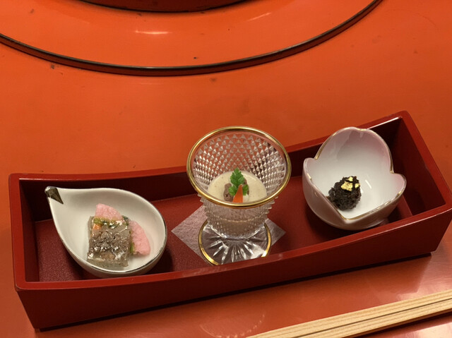 煮凝りはほんのりとした味つけ、ムースはキノコの香りと甘味が優しく、牛そぼろはしっかりとしたお肉の旨味で整えられた三段階の味の濃さを楽しむような取り合わせです
