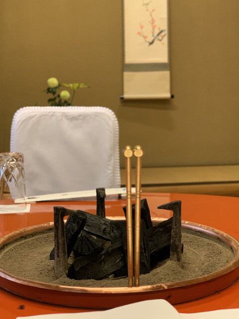 テーブル中央に備長炭をくべられると「パチパチ…」と僅かな火の粉が飛び散る